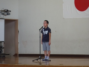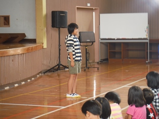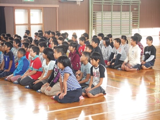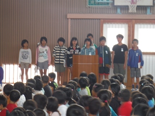 本日は全校集会があり、松山先生の話と童話発表会前のお披露目がありました。