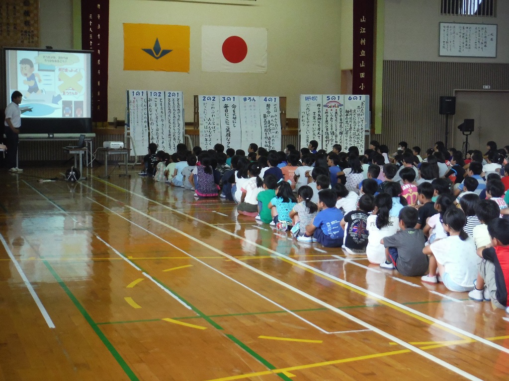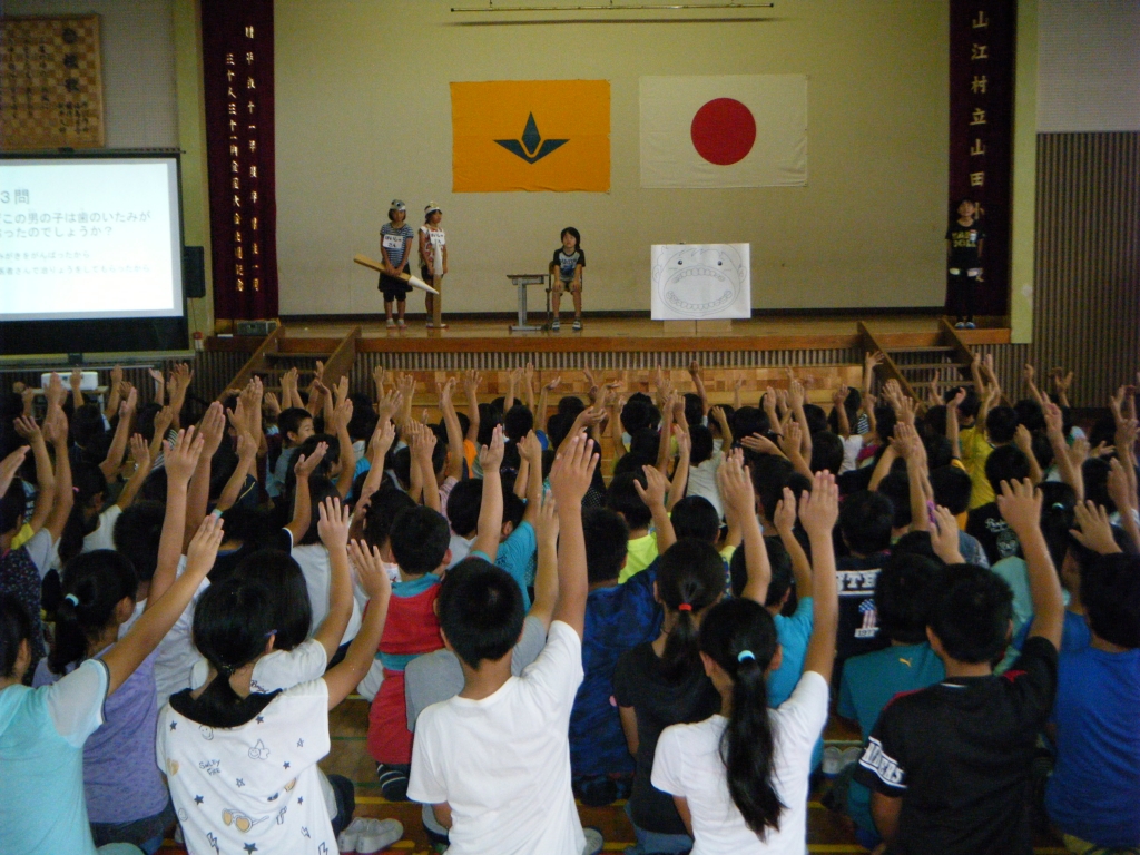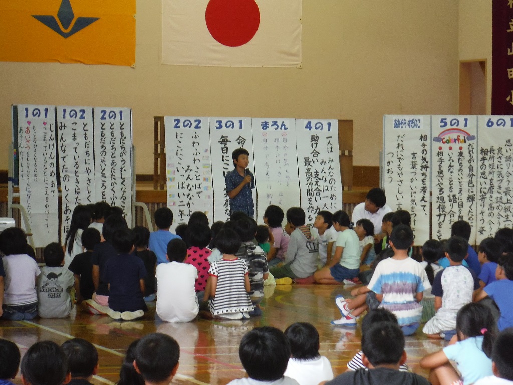 まずは、本校「なかよし委員」から、「なかよし委員会の本年度の取組」発表があり、山田小学校のみんながもっともっと仲良くなるための取組をたくさん紹介してくれました。