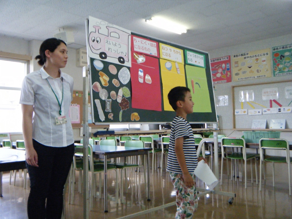 その次に、親子で食に関する授業を行いました。給食の食材を「赤」「黄」「緑」に分けることで、給食がバランスよく作られていることを実感することができました。