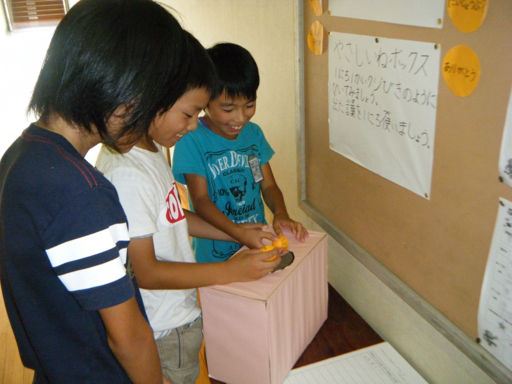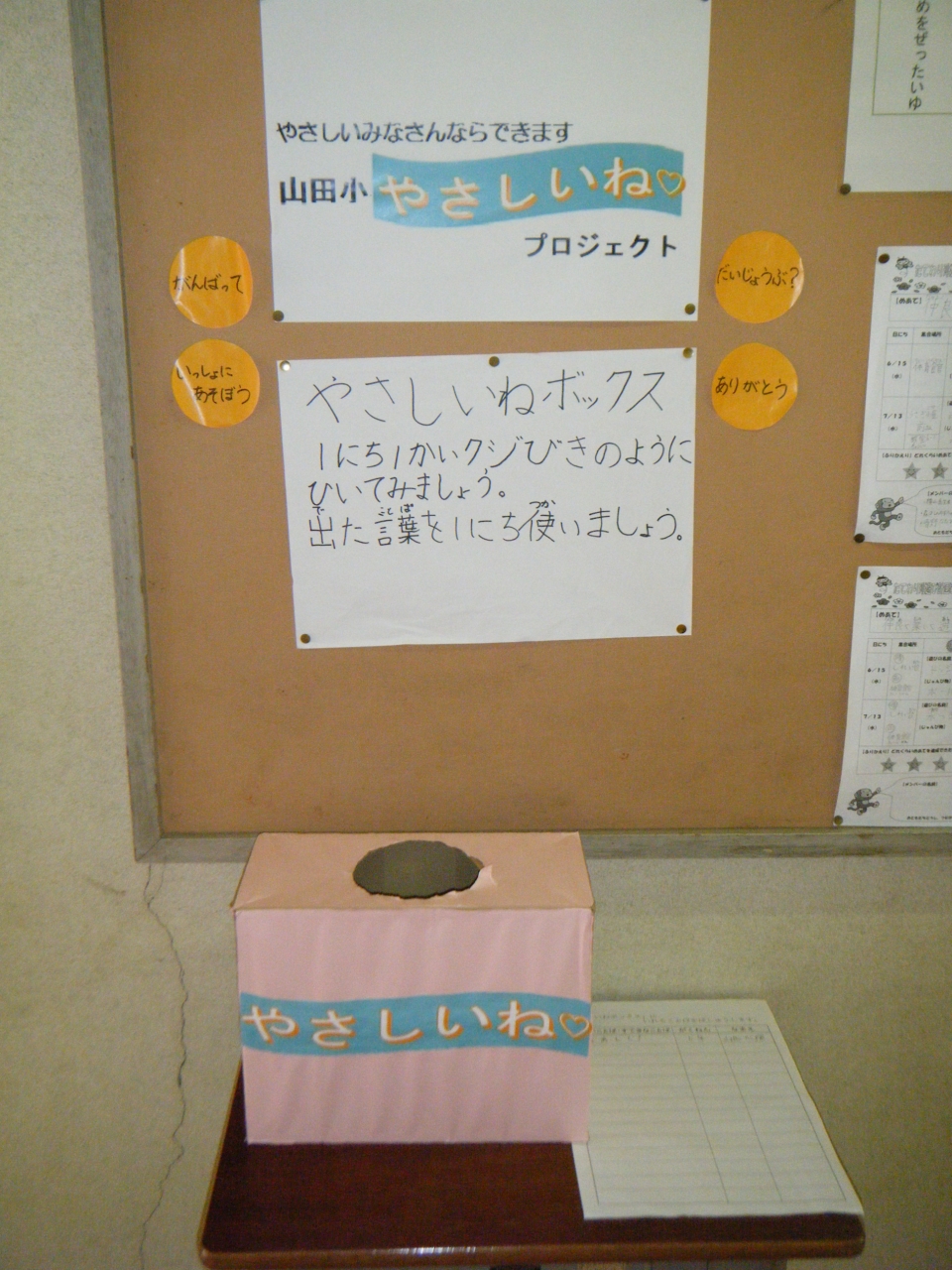 さっそく廊下に「やさしいねボックス」が置かれ、子どもたちがピンポン玉を引いていました。