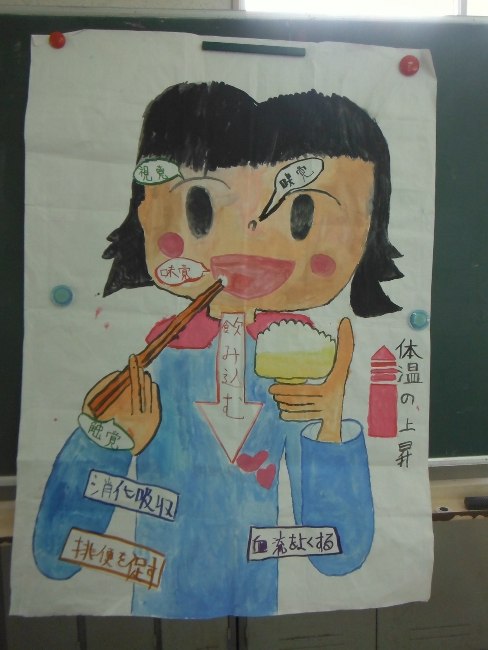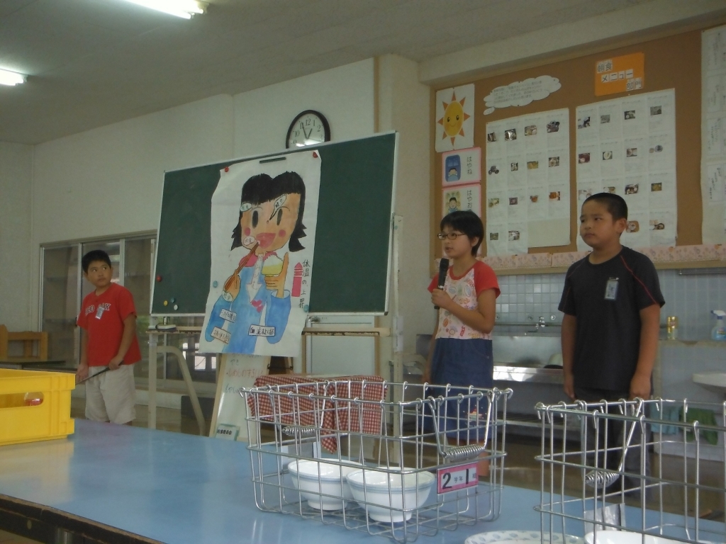 今月は食育月間です。食育月間の取組の一つとして、今日は給食終了後に給食委員会による発表がありました。わかりやすい大きなイラストを使いながら、「よく噛んで食べることの大切さ」等についてくわしく堂々と発表してくれました。