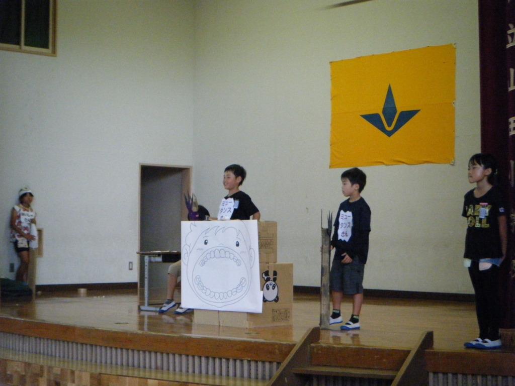 次に保健委員会からの発表がありました。発表に際しては、子どもたちから「劇を通して歯の大切さについてみんなに伝えたい」という自発的なアイディアがあり、養護教諭がアドバイスをしながら完成した発表劇でした。