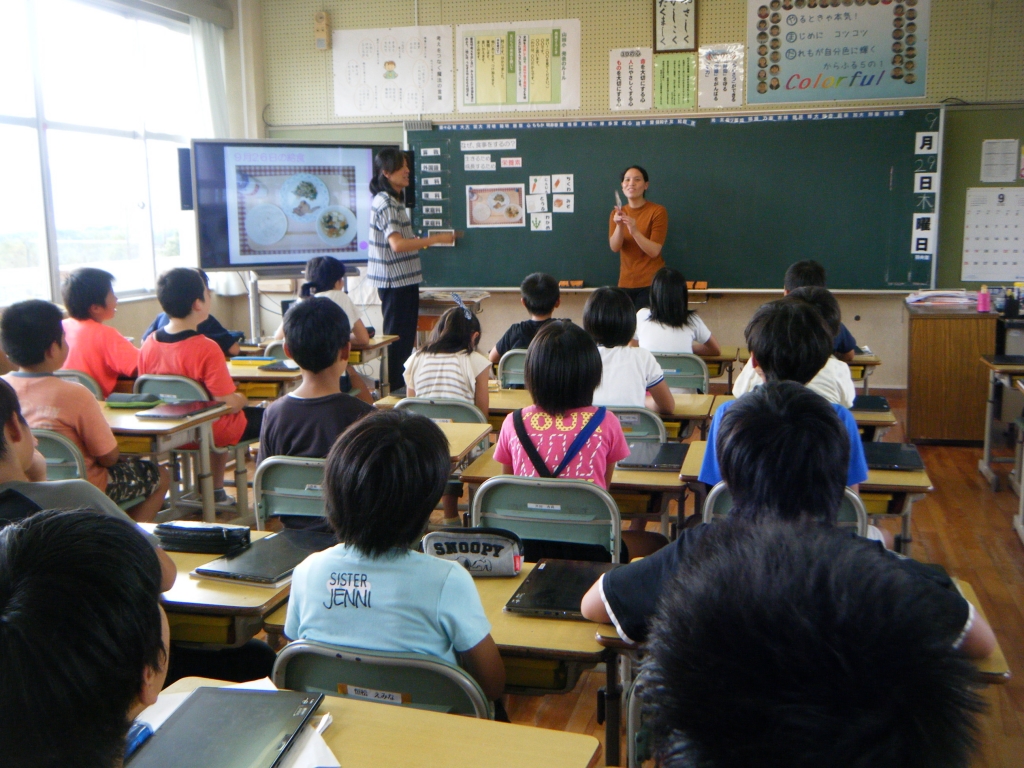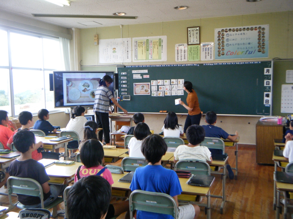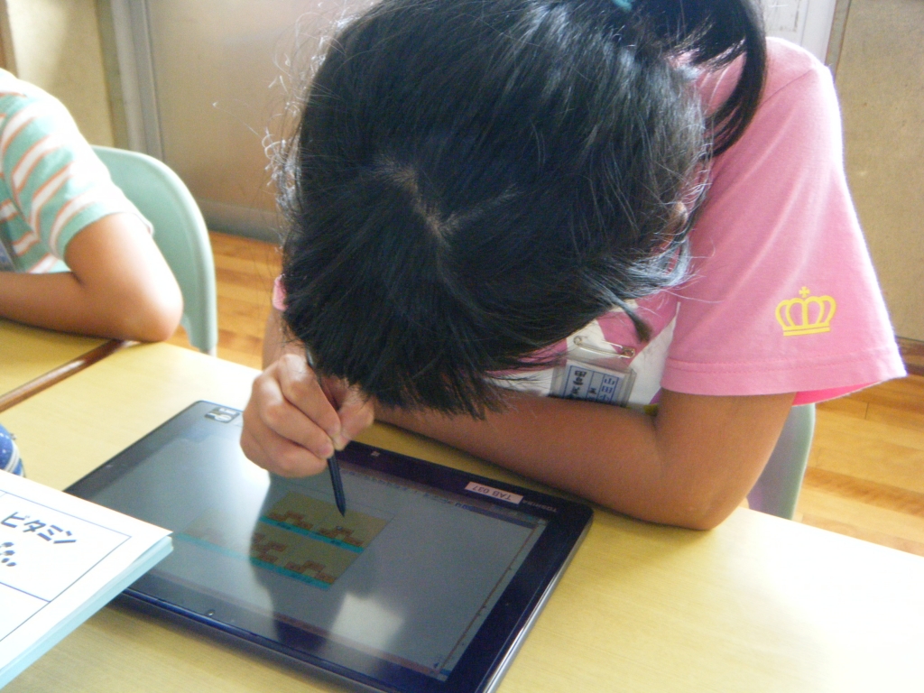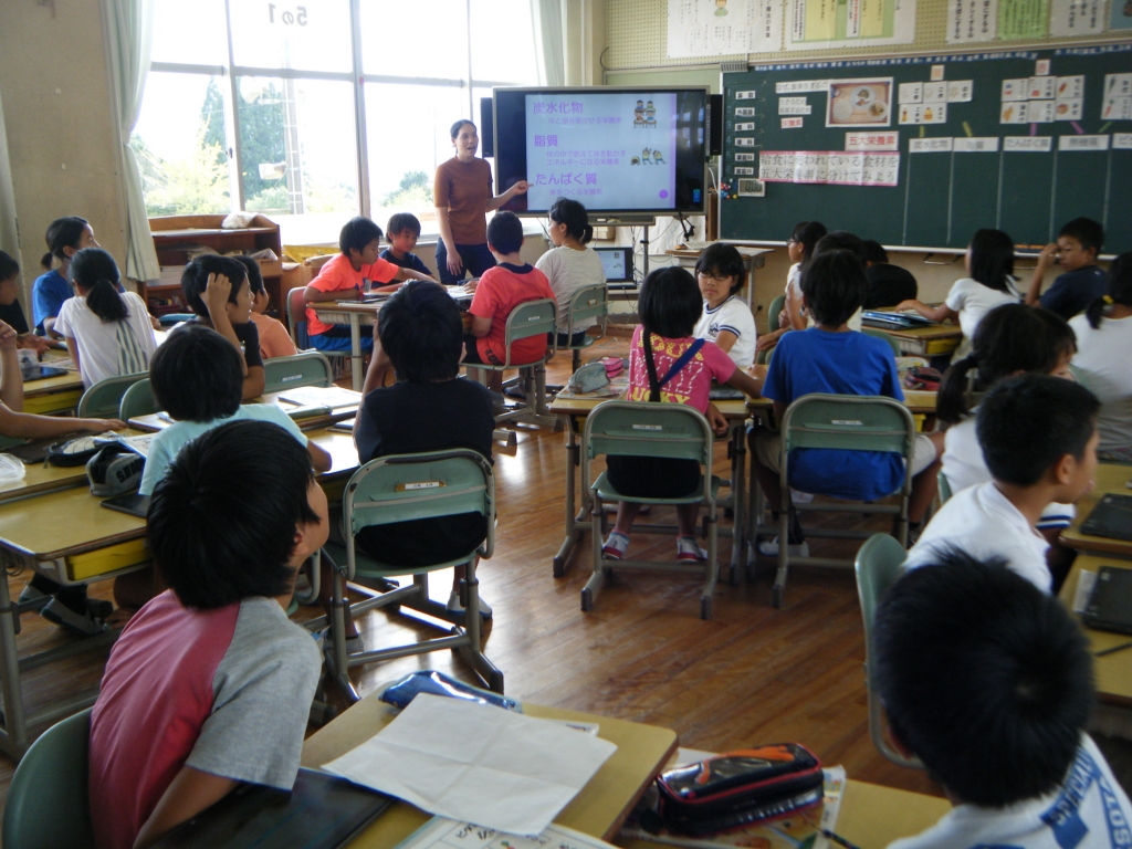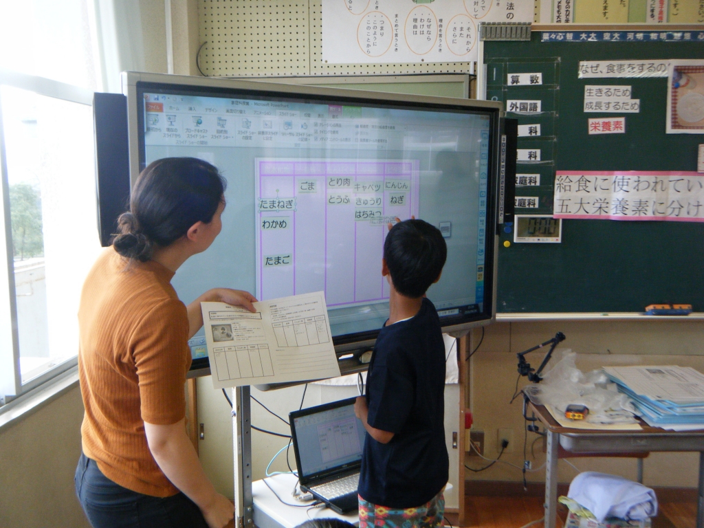電子黒板やタブレットを活用し、5大栄養素を仲間分けしたり、みんなの前で自分の考えを発表したりしました。