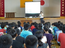 続いて、大中先生からの話では、ご家族の紹介から「家族との温かい絆」について、バスケットボールとの出会いからは「仲間の大切さ」について話をしていただきました。また、1995年の阪神淡路大震災(京都府在住時)、2011年の東日本大震災(東京都在住時)を経験され、今回の熊本地震から、改めて命の大切さを感じられたことを結びに、『何かに、一生懸命取り組む』『どこがいいかではなく、どんな風に過ごすか』『1日1日いろんなことに感謝をしながら大事に生きる』という言葉を子ども達に伝えていただきました。