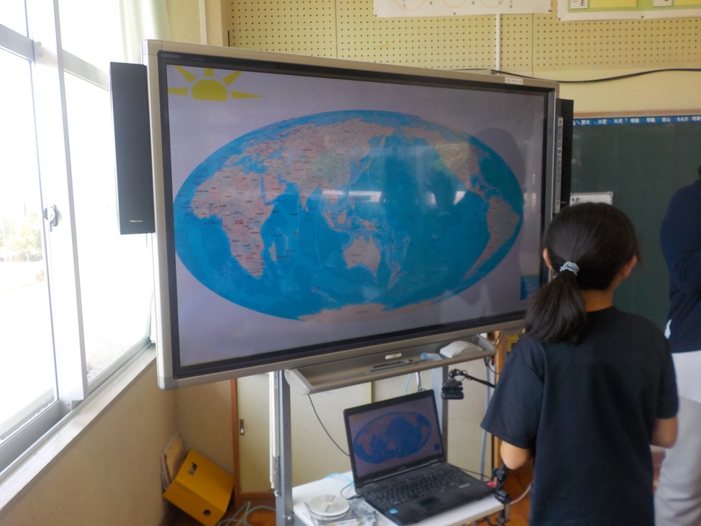 授業では電子黒板を使い、「自己紹介」や「〇✕クイズ(ALTの国のことについて)」等を行い、盛り上がるとともに、とてもよい異文化理解の時間になりました。