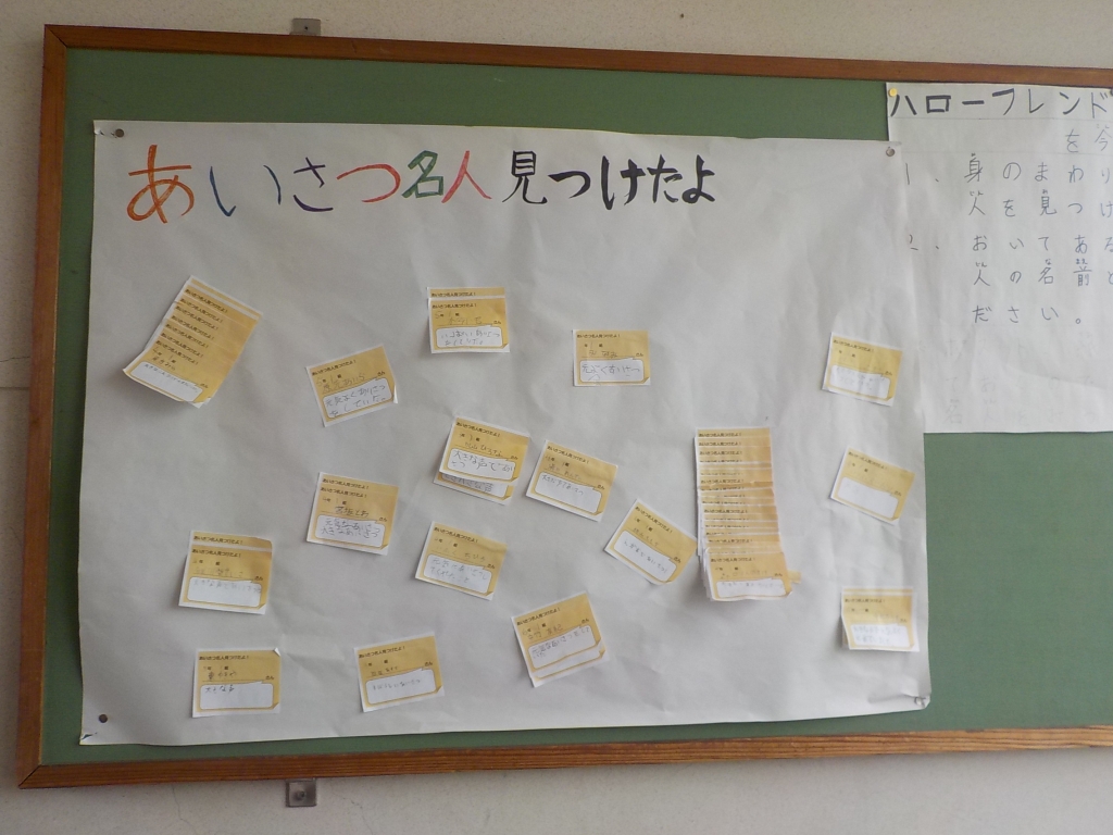 この下の写真の様子は、あいさつ名人の紙をはっているところです。この活動は、日々の学校生活の中で、「大きな声や気持ちのよい声であいさつした人」と思う人を紙に書きます。その紙を廊下にはってみんなに見てもらいます。たくさんはられた人は紹介されるという活動です。このように運営委員会は、学校を元気にするためにがんばっています。運営委員会のその他の活動はまた今度紹介します。