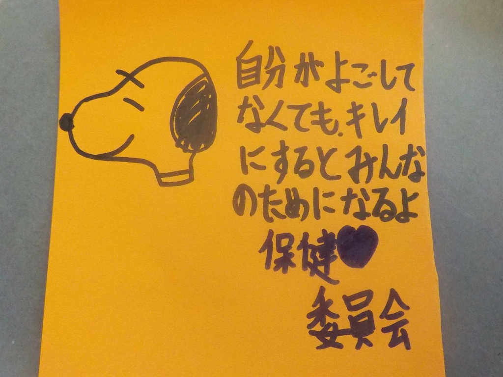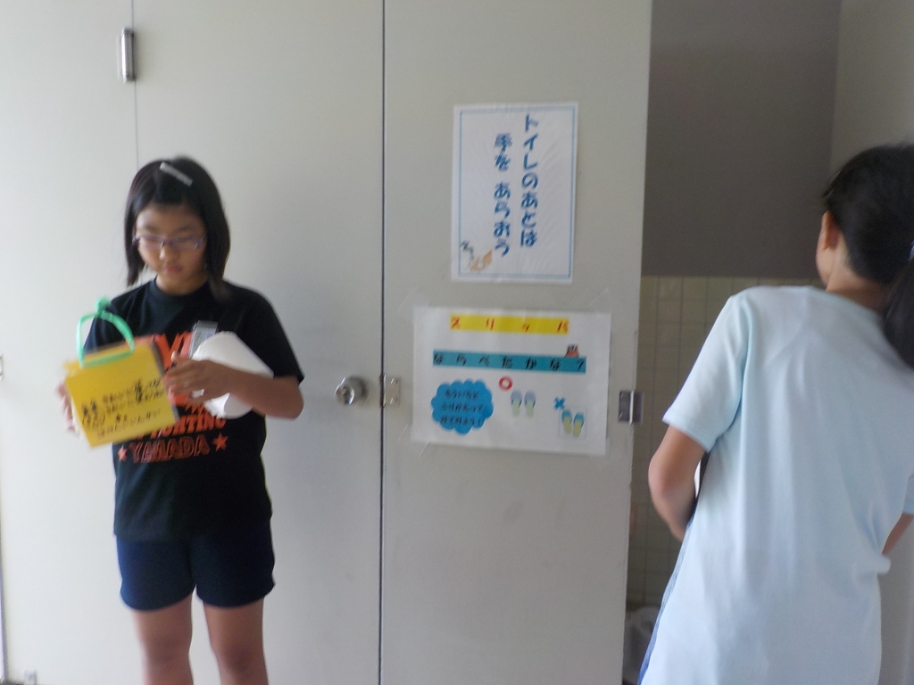 こんにちは。情報委員会の六年です。今日は、保健委員会の活動の様子を紹介します。保健委員会は、健康観察を各学年の所に持って行ったり、朝にはトイレットペッパーを補充したりトイレチェックなど様々なことをしています。