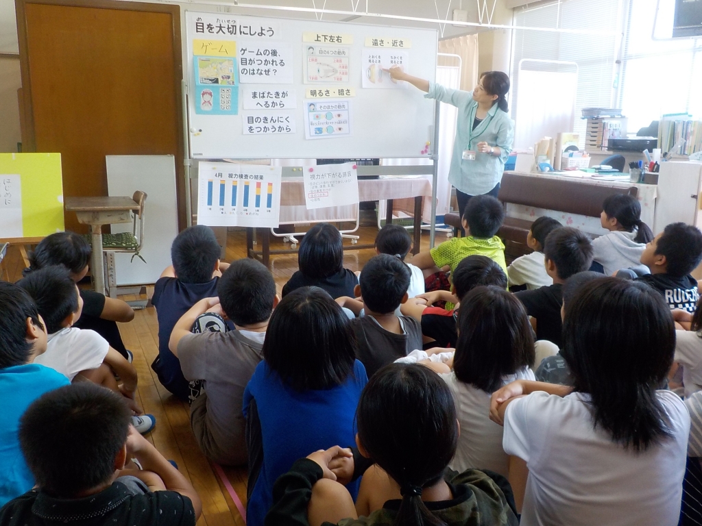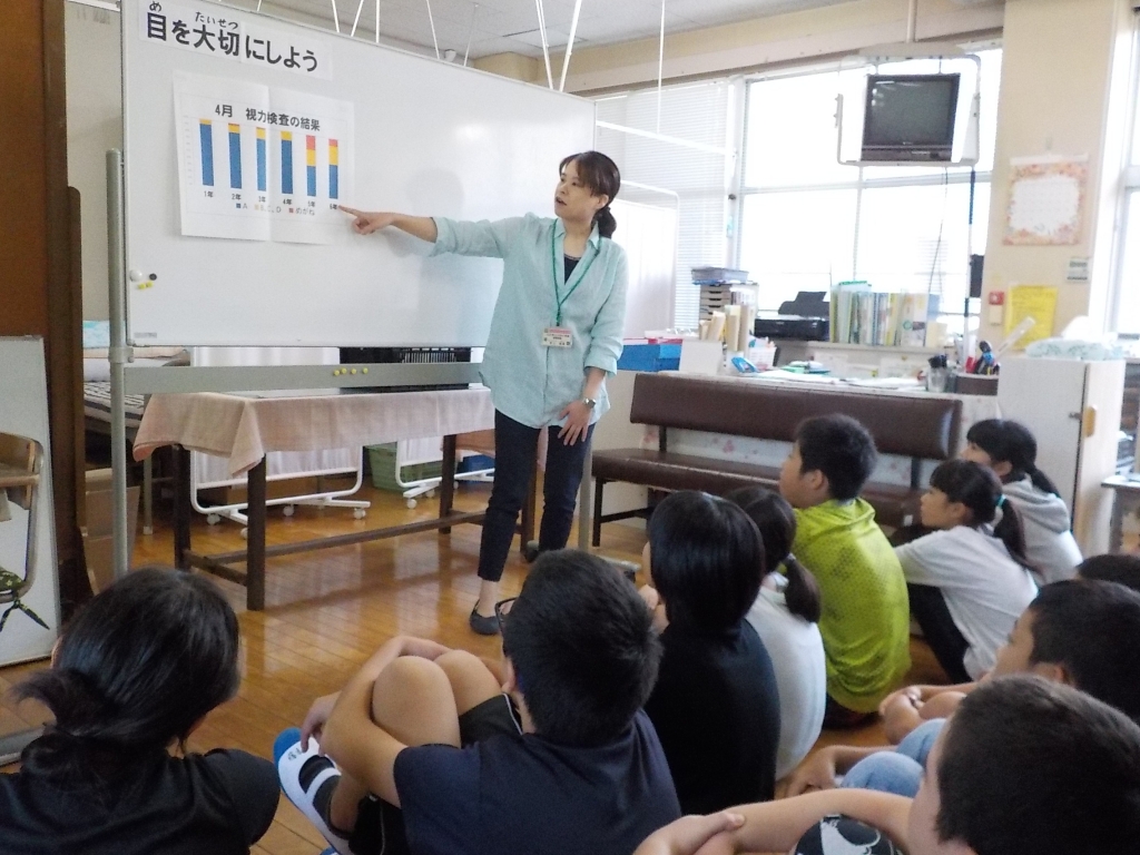 子どもたちは目の疲れる原因やその対処法等について、詳しく学ぶことができました。この学習を通して学んだことを、日頃の生活にいかしてほしいです。