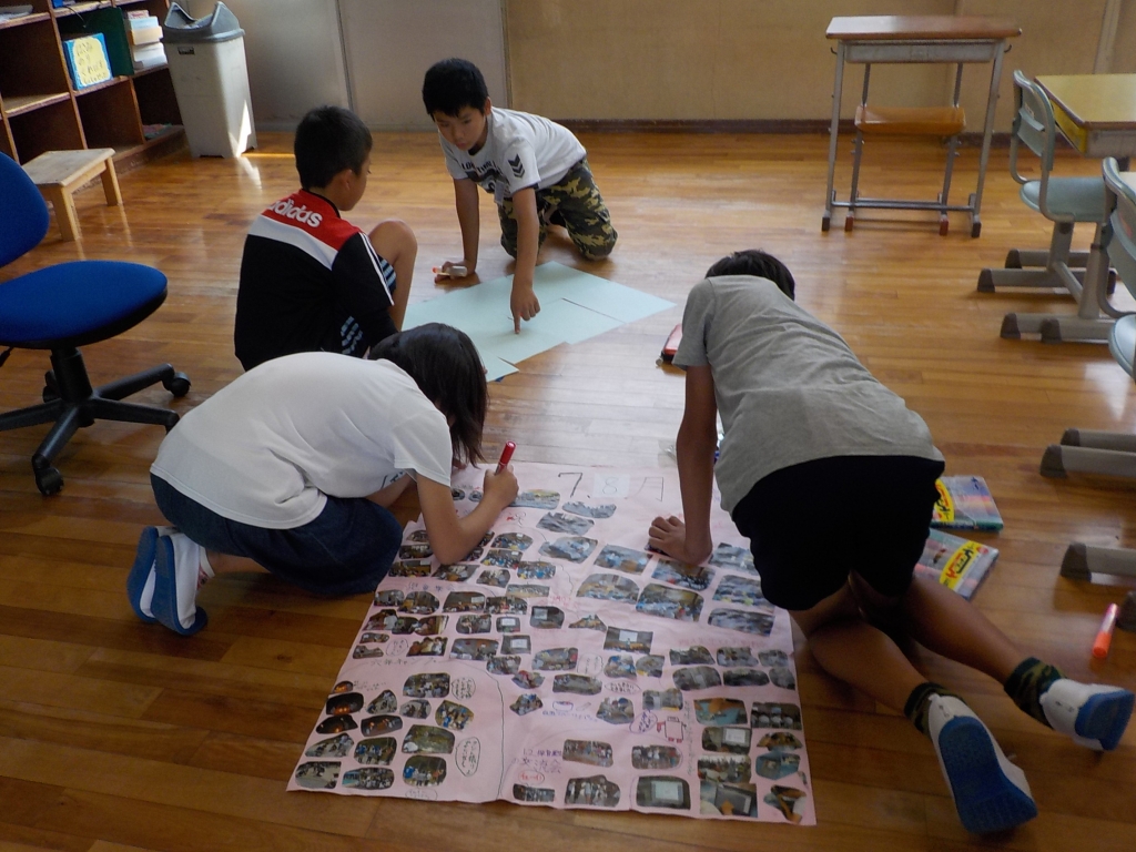 ぼくたち情報委員会では月行事の写真をたくさん集め、掲示板を作りかざっています。また、不定期で山田小学校児童のホームページの更新などを行っています。右下の写真はホームページに実際に文字をうっているところです。