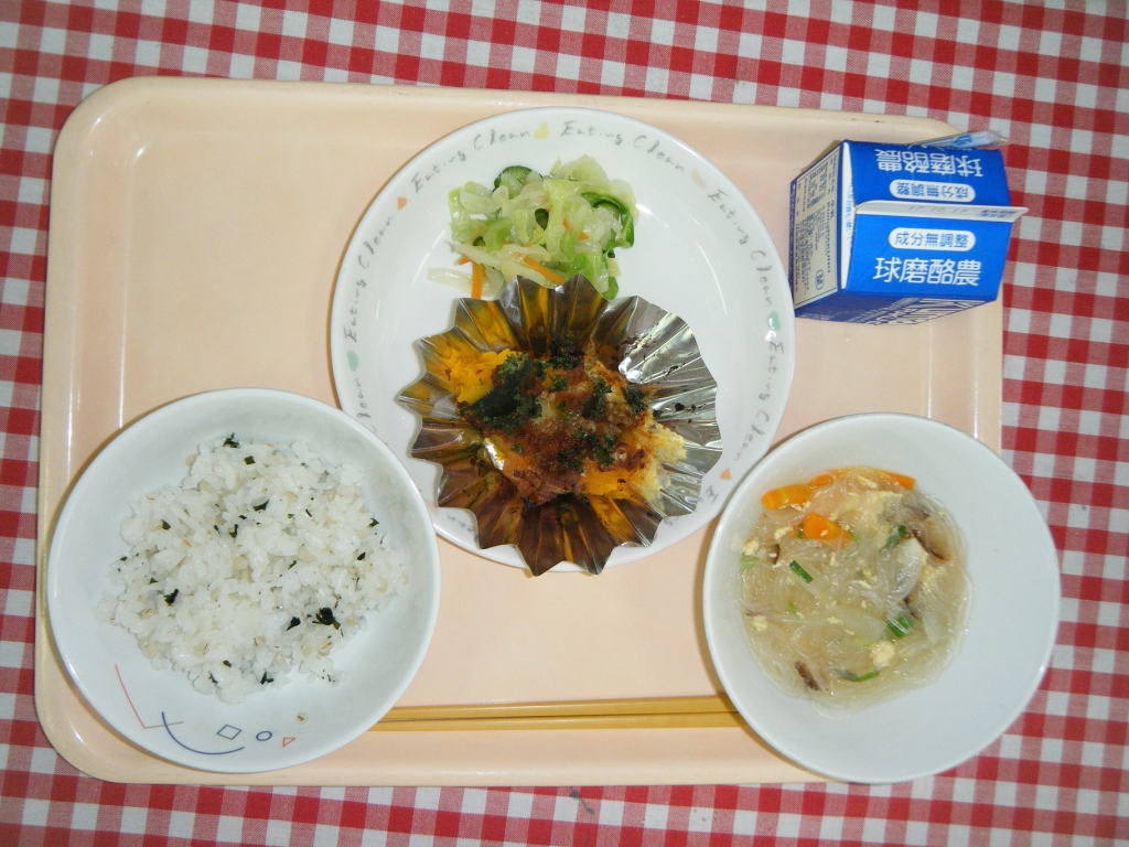 今日の給食のメニューには、「かぼちゃのミート焼き」が入っていました。給食終了後に、給食の先生から「かぼちゃは、ルテインやビタミンを豊富に含んでおり、目に良い」という話をしていただきました。