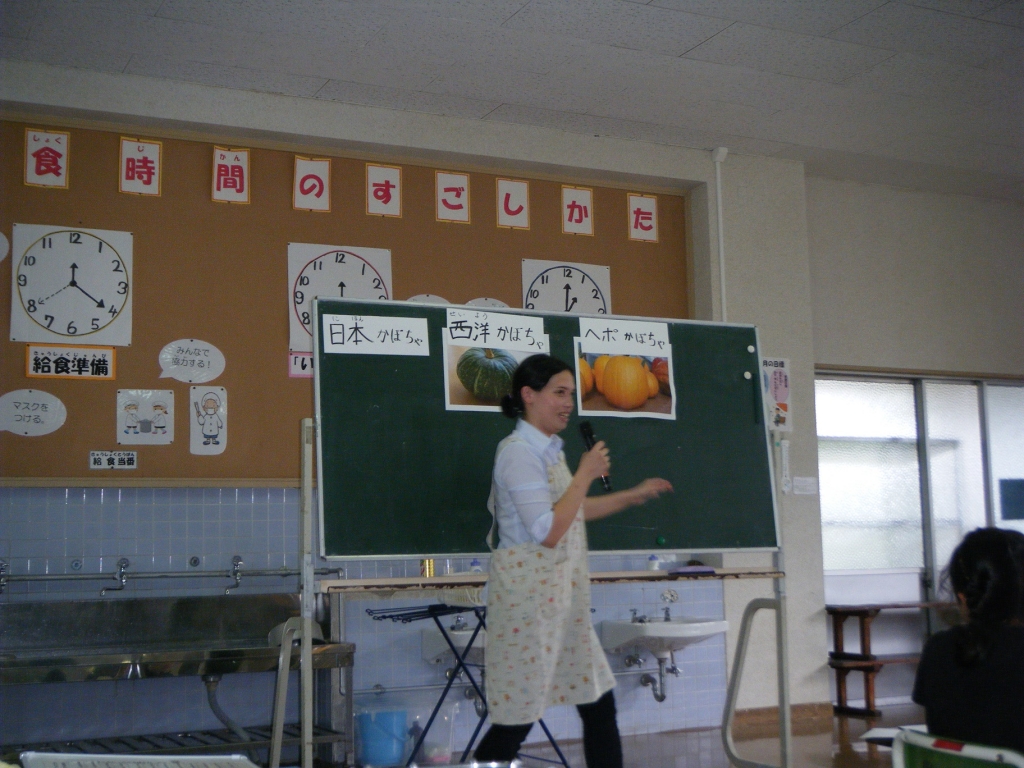 また、私たちが食べている「日本かぼちゃ」は「パンプキン」ではなく「スクワッシュ」であることもALTから教えていただきました。(パンプキンは、ハロウィーンで見るようなペポかぼちゃ)子どもたちの大半は、「かぼちゃといえばパンプキン」と思っていたようでした。(私も)