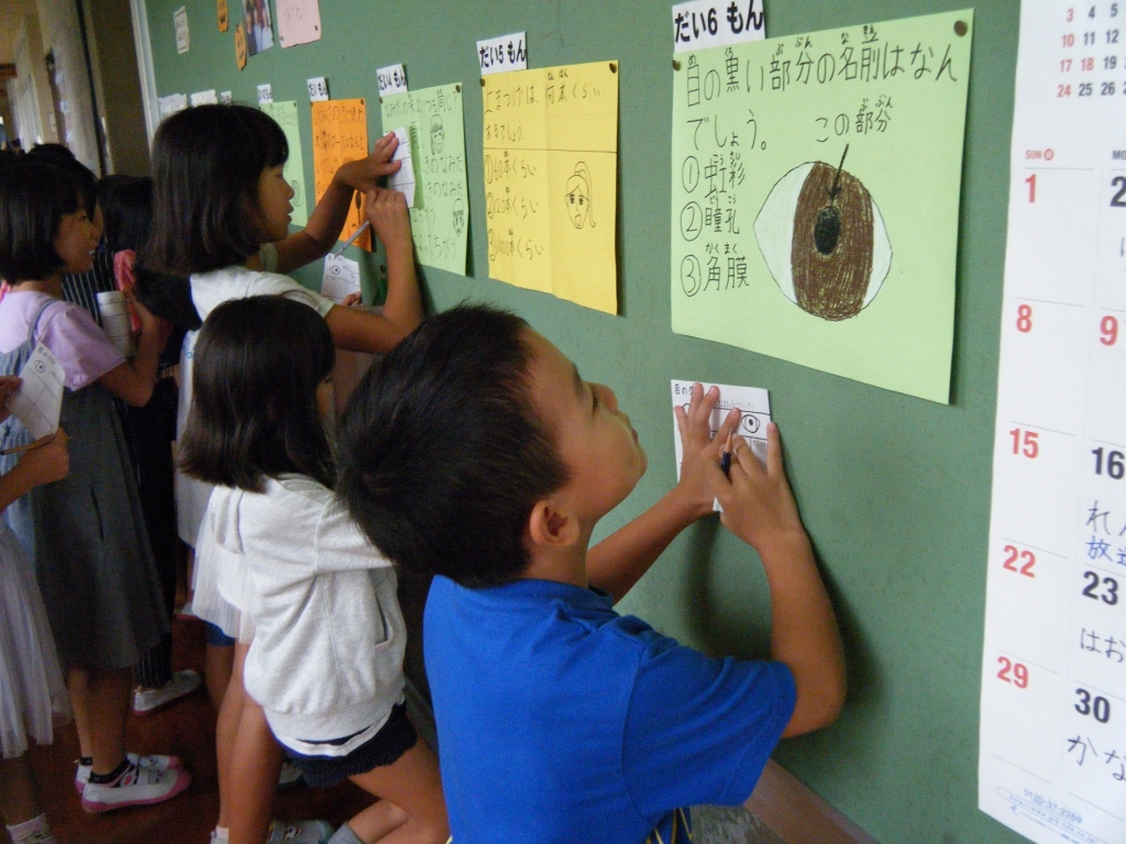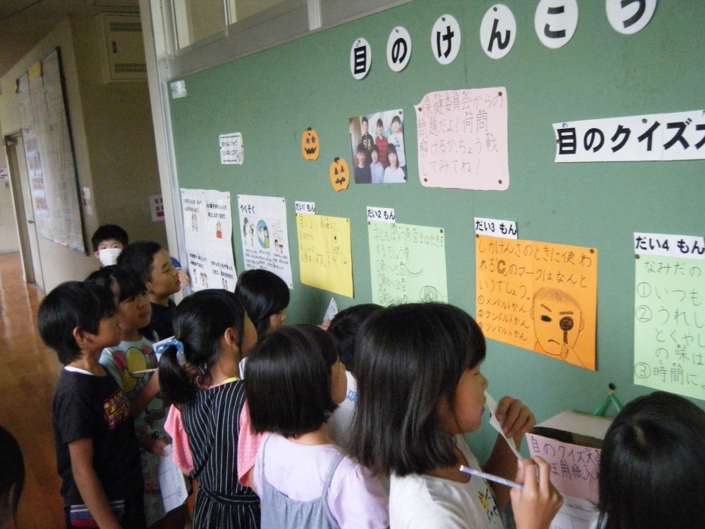 目の愛護デーにあわせて、保健室前掲示板には、目に関するクイズコーナーがもうけてあります。子どもたちには、一人一人に答えを記入するシートが配られており、全問正解者には、賞状が配られます。