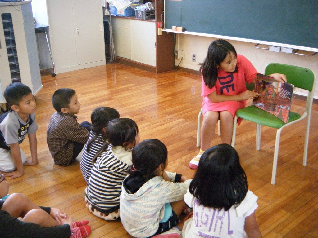 図書委員会の子どもたちが、昼休みに読み聞かせを行っています。子どもたちは、楽しそうに聞いており、「あの本借りてみよう」とつぶやいている子もいました。