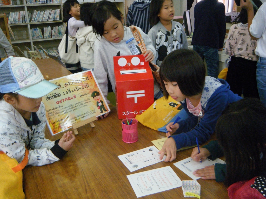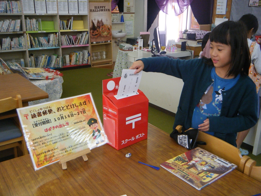 もみじ旬間の取組として、今日は読書郵便を紹介します。この取組は、往復はがきにおすすめの本を書いて、そのはがきを出したい相手(友だちや先生)に送ると、送った相手から感想が書かれたはがきが届きます。ポストに届いたはがきは、図書委員会のみなさんが、毎日配達しました。