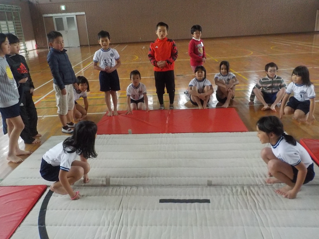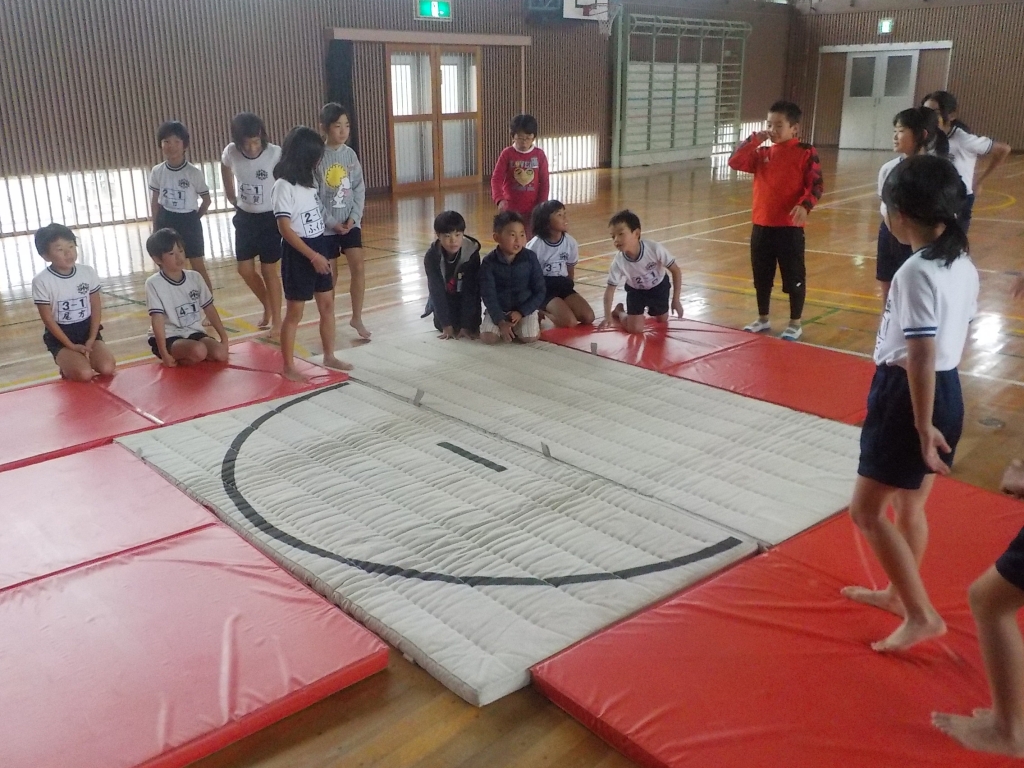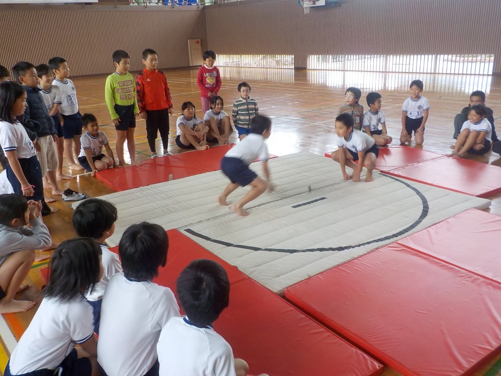 今日は雨だったので、体育館で「1班対3班」の取り組みが行われました。子どもたちは、全力で相撲をとっていました。
