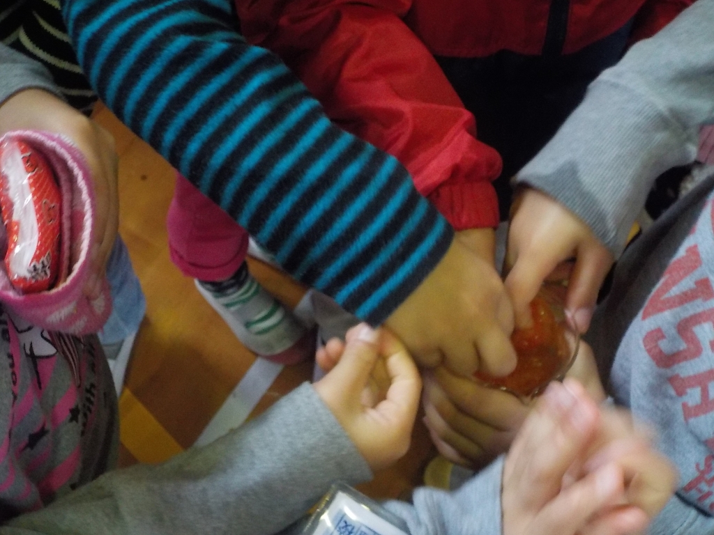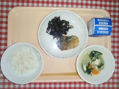 今日は、大根のみそ汁の中に、保護者の方からいただいた「冬瓜」を入れたメニューでした。いただきますの前に「冬瓜は夏にとれる野菜」であることや「冬瓜の名前の由来」等について話をされました。