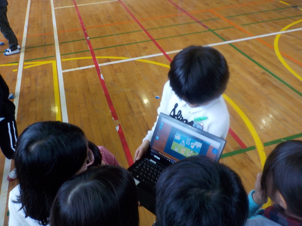 児童作成の「名刺・下敷き・カレンダー」披露や児童が作ったプログラミン体験