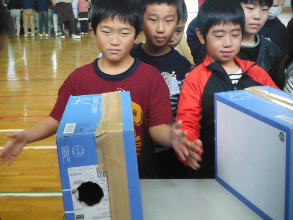 空気砲で紙コップを倒す体験と児童が作ったスライムをさわる体験