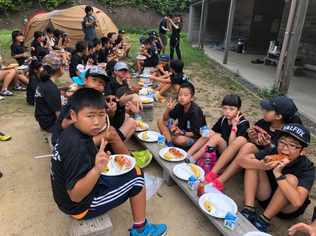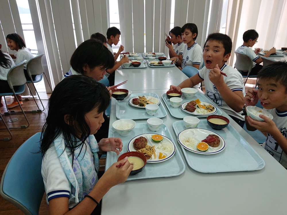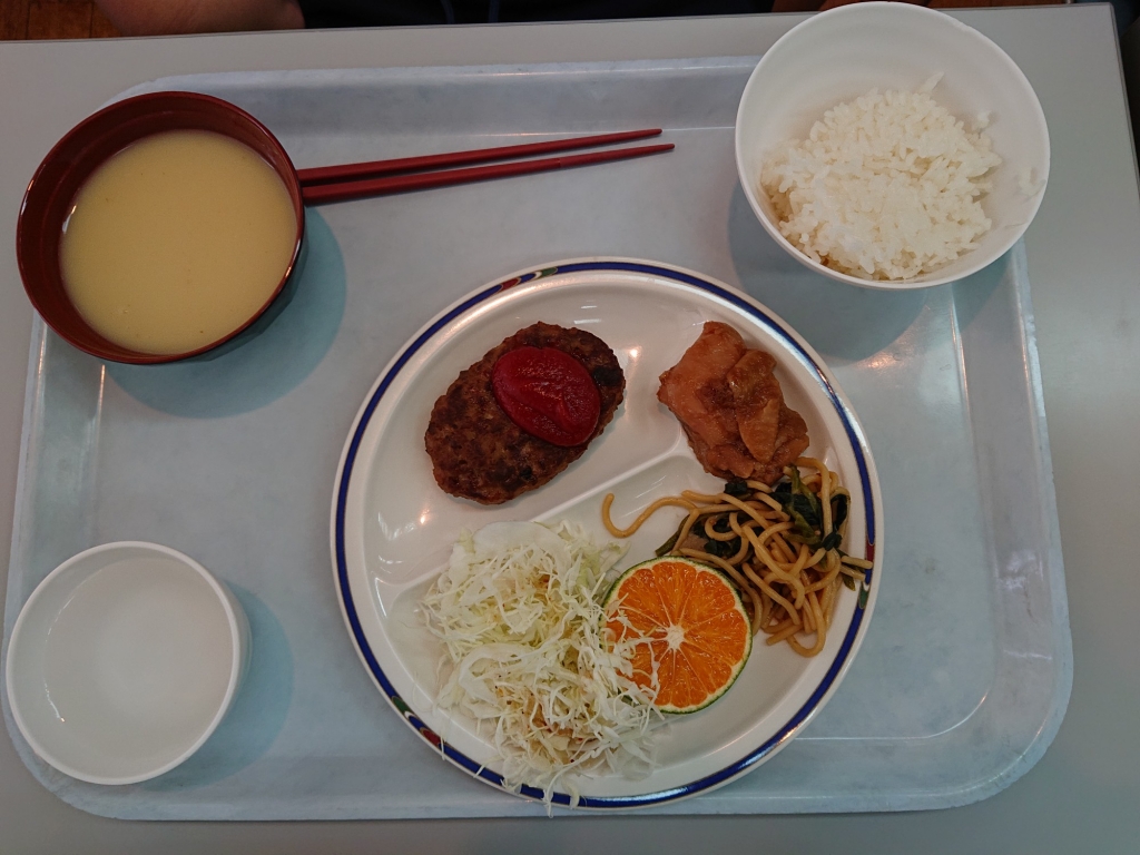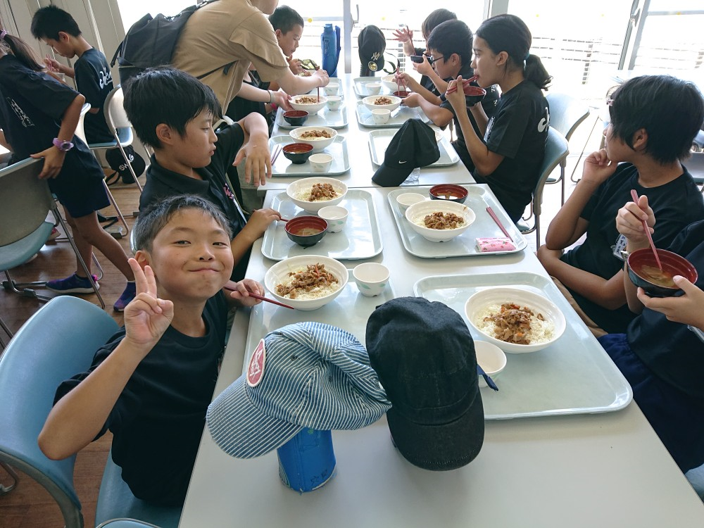 メニューは、ハンバーグ、鶏肉、パスタ、スープです。充実の活動の後、みんな美味しそうに食べています!!