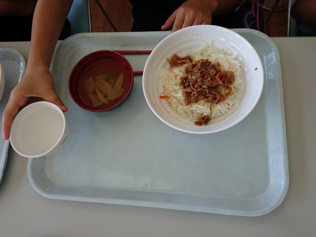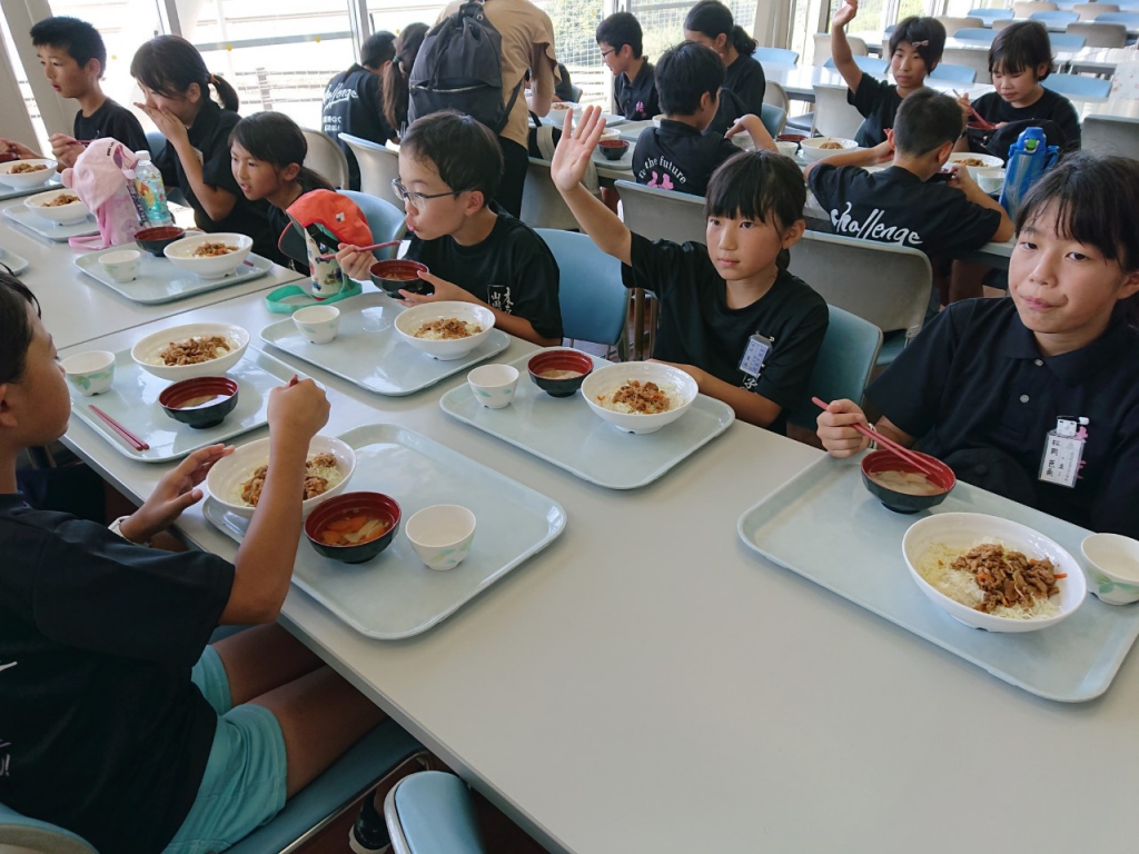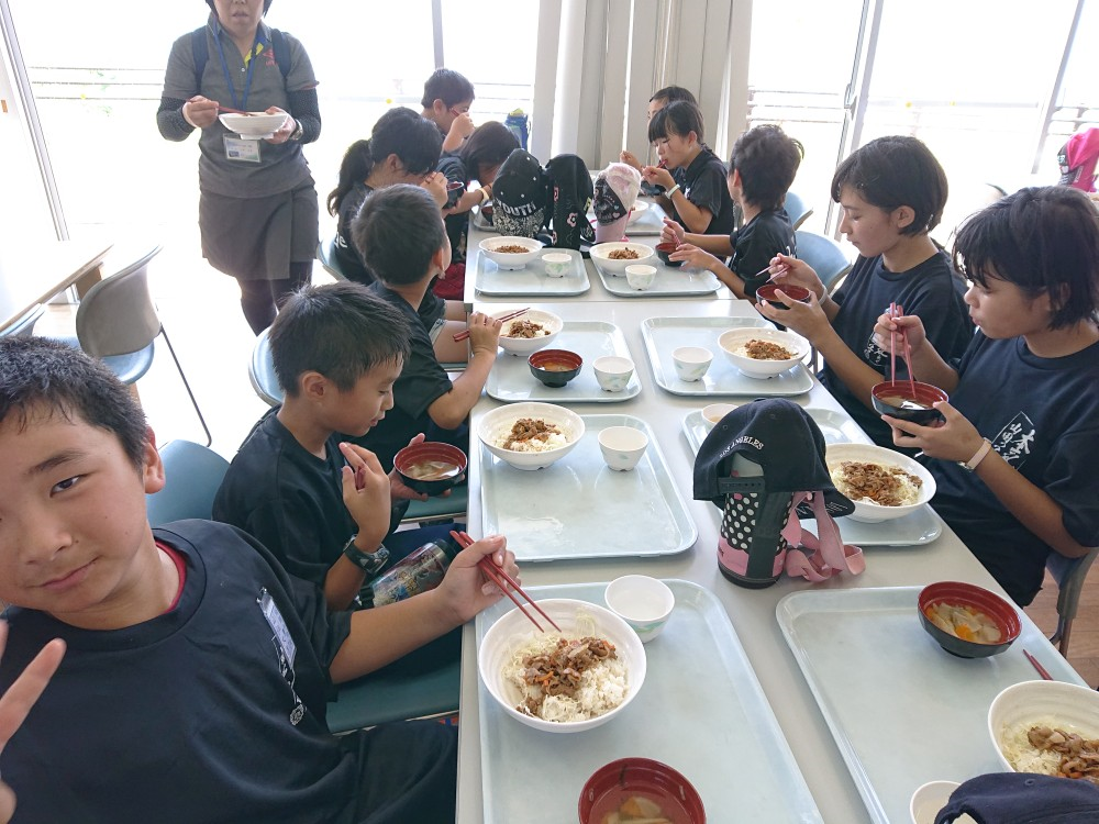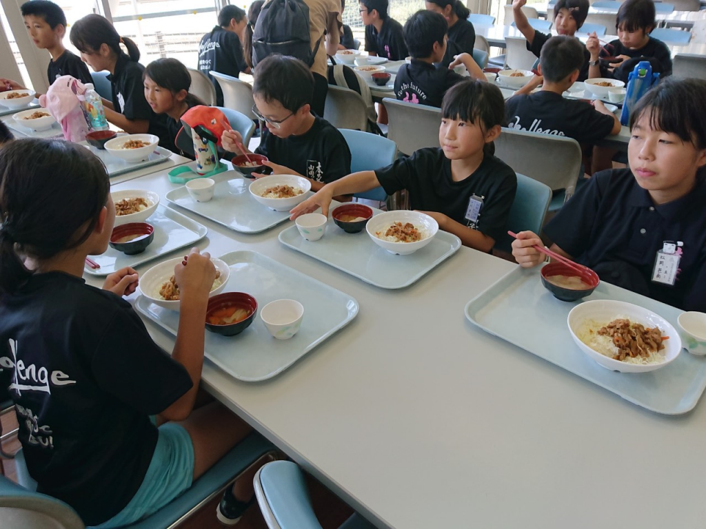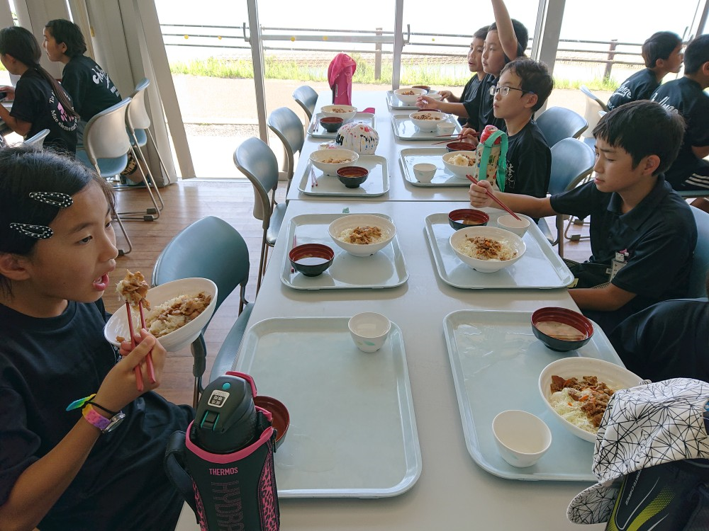 午前のローラーリュージュは楽しかったようで、おなかもへったようです。みんなモリモリ豚丼を食べています!!