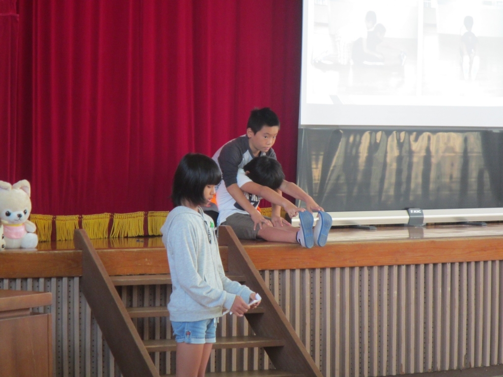 次に、体育委員会からの発表がありました。今年度の体力テストの結果が報告され、本校の課題について説明がありました。そして、課題克服のための運動の仕方を紹介しました。昨年度の取組の成果が、今年度の結果に反映されていたようです。今年度もみんなで取り組んで、元気で丈夫な体作りに励んでほしいと思います。