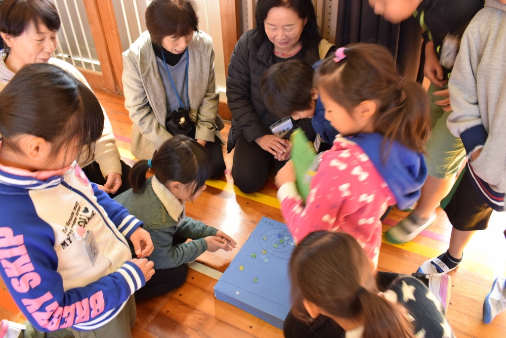 「かもつ列車・わらべ歌遊び」をした後に、縦割り班に分かれて「①折り紙、②とんとんずもう、③あやとり、④ふく笑い、⑤お手玉、⑦おはじき、⑧けん玉、⑨絵しりとり、⑩コマ回し」を行いました。