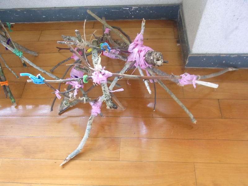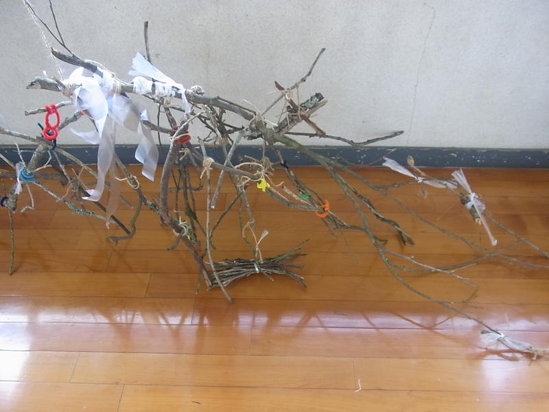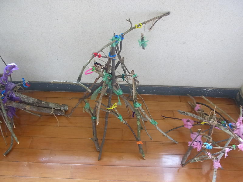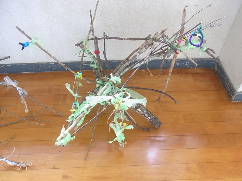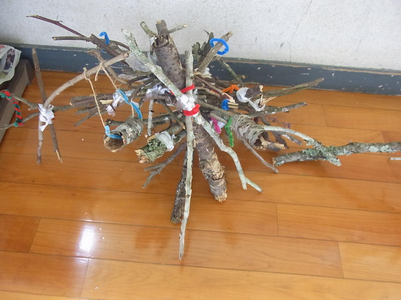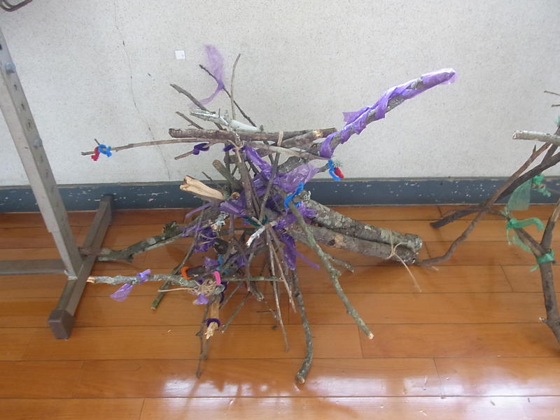 図画工作の時間に、「どんどんむすんで、どんどんつないで」の学習を行いました。グループで木の枝を集めて、協力しながらつないでいく4年生。「あれ、どうしたら立つのかな」「ここを結んでみたら?」試行錯誤しながらも、素敵な作品達ができあがりました。