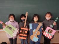 3年生は図工の学習で、空き箱やラップの芯などを材料に、ギターや三味線などの弦楽器を作成しました。色も形も違うオリジナルの楽器が完成しました。