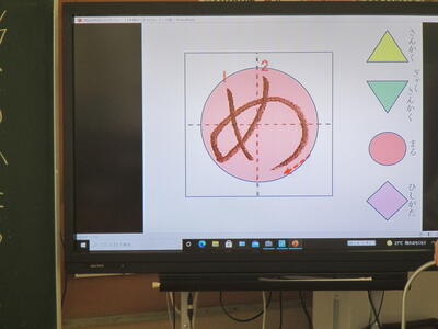 「め」を整えて描くには? 〇を選びました。 電子黒板で「め」を整えて描く外形を確認します。