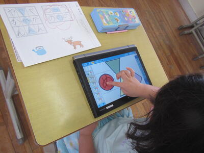 児童はタブレットPCに表示されたひらがなに合う形を選んで動かし、重ねて確認していきました。