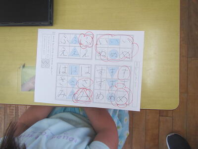 めあては「じの かたちに きをつけて かこう」です。文字の外形を考えて「△・▽・〇・◇」のどの形にすると整った文字が書けるのか見つけます。