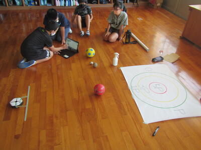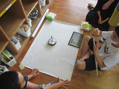 その中で、パソコンクラブがルート(プログラミングロボット)を使って「カーリングゲーム」を作っていました。