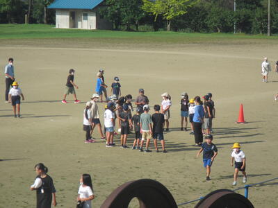 15日の天気は久しぶりの「晴れ」。児童は朝から縦割り班遊びで元気に運動場を駆け回りました。
