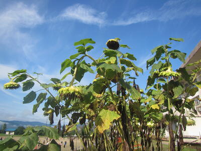 終わった後は全員で振り返り、挨拶をして教室に戻ります。 爽やかな秋晴れでした。ヒマワリの種もたくさんできています。