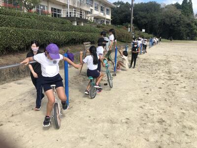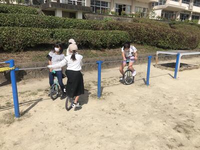 大きさも大小2種類あり、自分に合った一輪車を選ぶことができます。さっそく昼休みには、楽しんで練習に励む子供たちの姿が見られました。