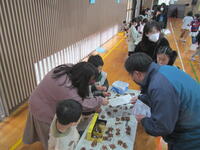今日の日に備えて学校や生活科の見学旅行で行った先々で「どんぐり」や「きれいな落ち葉」などの「秋」をたくさん見つけ、それを使った飾りやおもちゃが体育館にたくさん並べられていました。