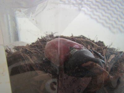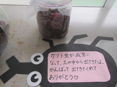 理科室入口に置いてある観察用のカブトムシのさなぎの中の一匹が成虫になりました。6月にさなぎになり始めてからおよそ1か月がたっていました。ガラス瓶の中で動いている姿を見た人もいます。命の誕生を間近に見ることができて感動しました。