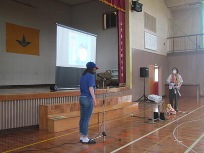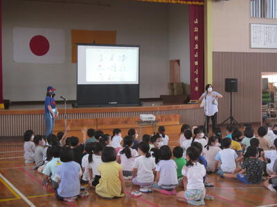 本日の全校集会はALTのケイト先生と澤村先生で読み聞かせをしていただきました。英語の絵本で「野球」に関する話でした。2人で英語と日本語を使い分けながら低学年の児童にもわかりやすく話してくださいました。日本とアメリカの野球の応援の仕方や野球場で食べる物の違いも分かり、みんなで楽しい時間を過ごしました。