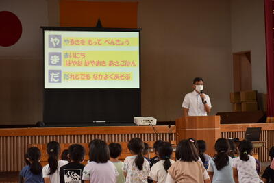 1学期の登校の様子や地区での生活について振り返ります。  夏休みを楽しく過ごすために、先生の話もしっかり聞きます。