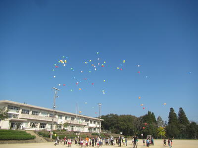 4年生が5月12日に種をまいてから約6か月。「人権の花」として大切に育ててきた花の種を取り、風船に結び付けて大空へ放ちました。今年は雲一つない晴天となり、またほぼ無風の状況だったため、児童の手を離れた色とりどりの風船は真っすぐに上昇していきました。風に乗ってどこまで飛んでいくのかわかりませんが、風船を見つけられた方は、ぜひ山田小学校までご連絡ください。