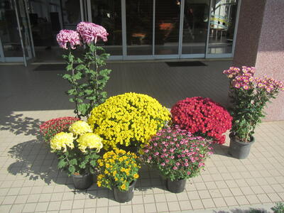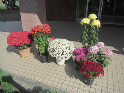 学校給食でもお世話になっている山江村の蕨野三千男様からお借りしている菊の花が満開になりました。大倫の花や小菊など色も大きさも違うきれいな花を咲かせ、小学校の玄関を華やかにしています。黄色い小菊はつぼみだったものが大きく花開き、それは見事な姿になっています。毎朝気を付けながら栽培委員会の児童が水やりをして大切に育てています。もうしばらくはこの美しい眺めが楽しめそうです。