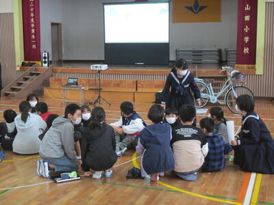 11月17日(木)第5校時に山江中学校の3年生7名が本校を訪れ、6年生を対象に交通安全教室を行いました。山江中生として3年間の学校生活で学んだ自転車の安全な乗り方や危ない場所について、動画やプレゼンテーション・クイズなどを駆使しながらわかりやすく伝えていました。6年生も真剣に、また楽しく学ぶことができたようです。ここまでの準備も大変だったと思います。中学生には感謝するばかりです。なお、この様子は山江中学校の文化祭で披露するとのことでした。
