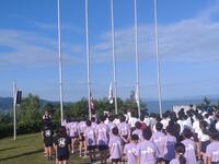 2日目最初の活動は、朝のつどいです。つどいの広場で、旗の掲揚やラジオ体操、団体紹介を行いました。