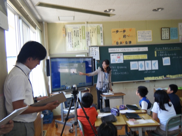 今日の2校時は5年生の算数科「合同な図形」の研究授業がありました。この研究授業は、熊本県教育委員会指定の『ICTを活用した「未来の学校」創造プロジェクト』の研究内容にもなっています。本時は三角形の内角の和が180度であることを活用して、四角形の内角の和の求め方を考えて説明できることが目標でした。導入では、電子黒板でのプレゼンテーションを活用し、ポイントを絞って効率よく前時の振り返りが行われました。また、長方形や平行四辺形など、対角線で分けて合同について考えた図形も一緒に提示することで、三角形に分けて考えるという見通しを持つことができるように工夫されていました。