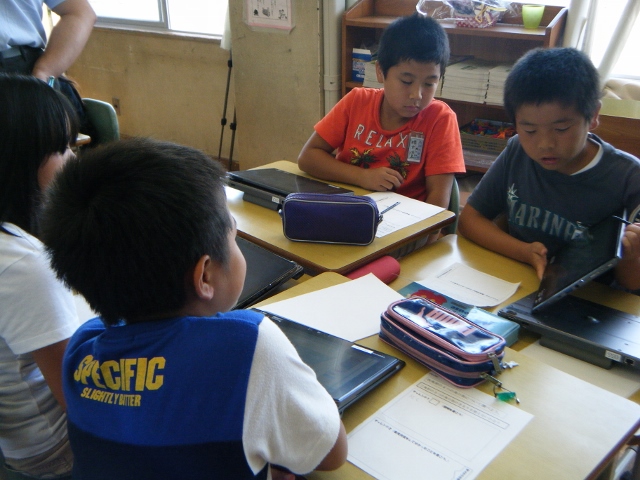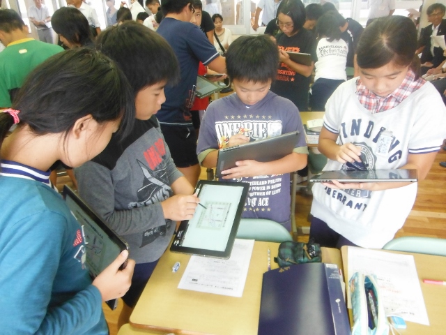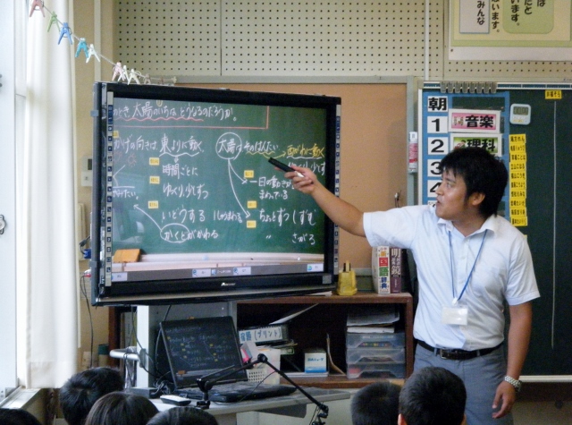 プレゼンテーションソフトを用い、全体で既習事項を確認することで、影の向きと太陽の位置を関連付けて考えることへの焦点化を図り、課題解決の見通しがもてるようにしたり、タブレットPCを用いて、図に書き込ませながら説明し合うことで、影の向きと太陽の位置の関係が図解的に理解できるようにする授業でした。子どもたちは元気よく授業に集中していました。