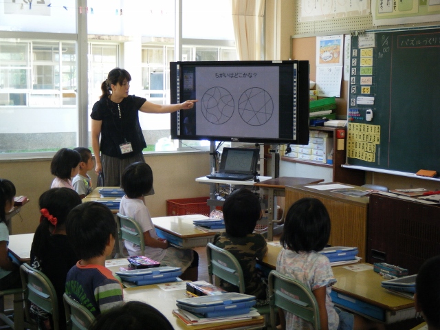 子どもたちは、タブレットPCに提示された円の中に直線をひく活動をとても意欲的に行っていました。子どもたちにとって、タブレット上では、紙やノートに鉛筆で直線を引くのとは違い、簡単に、正確に直線をひくことができるというメリットがあります。一人で何回もパズルづくりに挑戦していました。