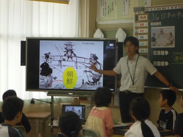 プレゼンテーション資料を電子黒板で提示し、「驚き」「葛藤」「困惑」「矛盾」を持たせることで、『なぜ、日本と中国、日本とロシアは戦争をしたのか』という問いを子どもたちから引き出したり、練り上げる場面では、電子黒板やタブレットPCに、自分の考えの主張点を書き込ませながら伝え合うことで、「考えを共有」した授業でした。