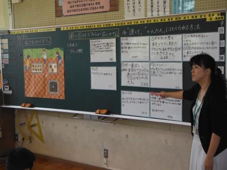 大研は4年算数科礒田教諭でした。学習者用デジタル教科書を活用して、「広さ(面積)」について考える授業でした。4年生の子どもたちの授業に取り組む姿勢の素晴らしさ、自分の考えを一生懸命考える姿、意欲的なグループでの学び合いがキラリと光る授業となりました。算数科における「問題解決的な協働学習」のモデルも提案していただき、本校にとっても実りある研修となりました。