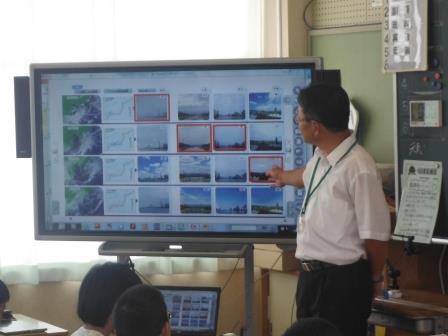 5年理科では、「天気の変化」(学習者用デジタル教科書活用)で天気が西から東に動くことを考える授業でした。学習者用デジタル教科書の天気・アメダス・雲の動きなどの写真を活用しながら、個人、グループ、全体と学習形態を変えながら考えをまとめていきました。タブレット端末やデジタル教科書の活用にもとても慣れている5年生です。