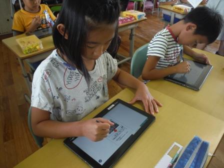 3年理科は、「かげのでき方」(学習者用デジタル教科書活用)で、かげと太陽の位置がどのような関係にあるか考える授業でした。外で撮影してきた写真を教室に持ち込み、考察を深めました。まさにタブレット端末ならではの活用です。児童はグループで学び合う中で、「かげは太陽と反対側にできる」という事実に気づくことができました。研究発表会当日も理科の授業を行う3年生です。タブレット端末を使って学び合う3年生の姿にご期待ください。